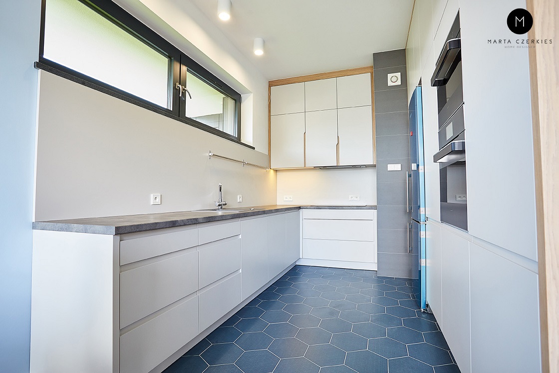 - Nowoczesny styl i kolorystyka wnętrza – biele, błękity, szarości, a także wykorzystanie elementów drewnianych charakterystycznych dla skandynawskiego stylu.