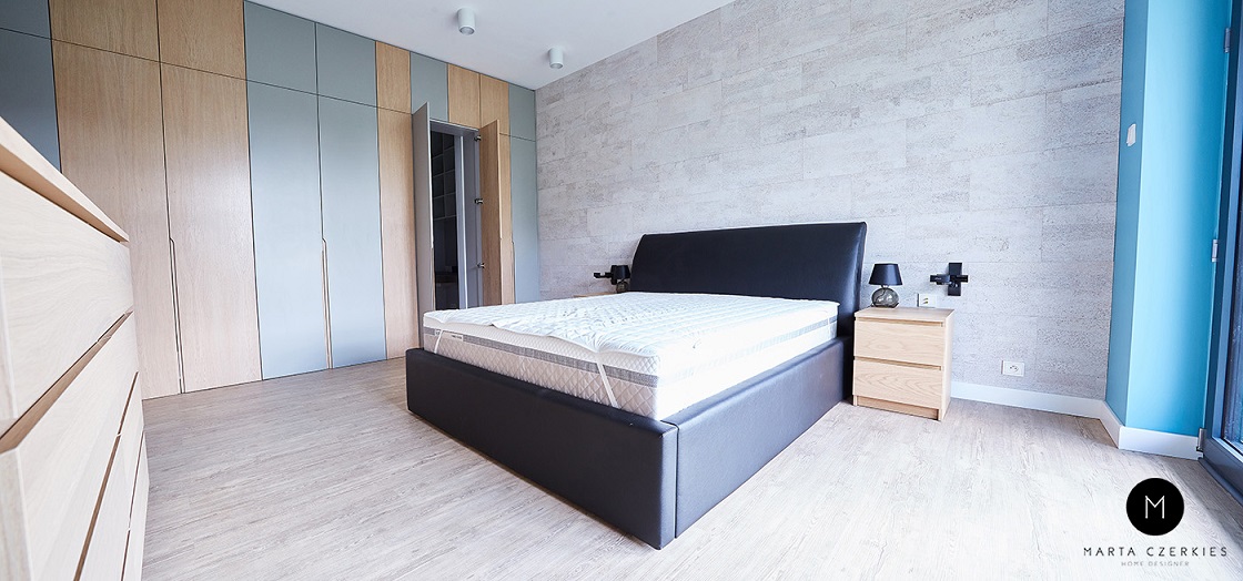 Pierwszą zaprojektowaną w sypialni częścią była ściana wygłuszona za pomocą miękkiego korka. Korek wygląda jak kamień, dzięki czemu wizualnie tak świetnie się prezentuje. W efekcie materiał na ścianie pełni podwójną funkcję – nie tylko wygłusza, ale także daje wspaniały efekt wizualny!